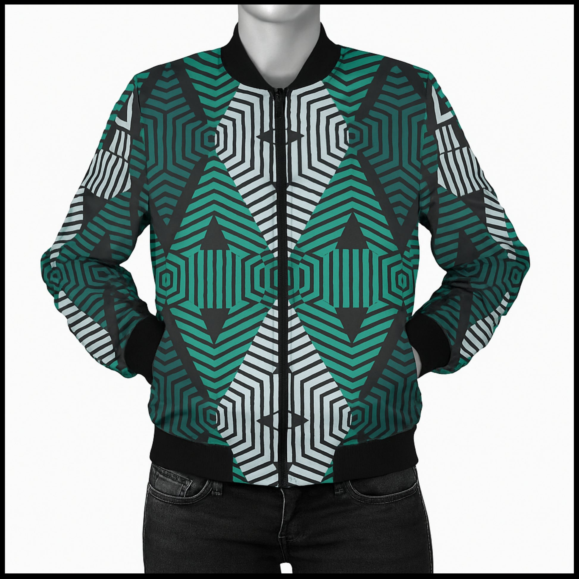 BoomBox Vibes Green White Boho Lace Fleece Bomber Jacket – Ethnic Seamless Streetwear