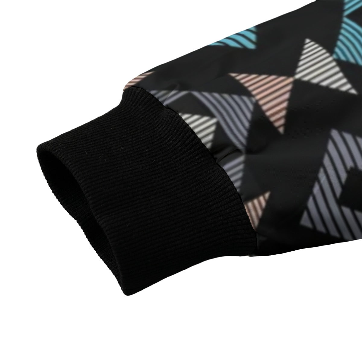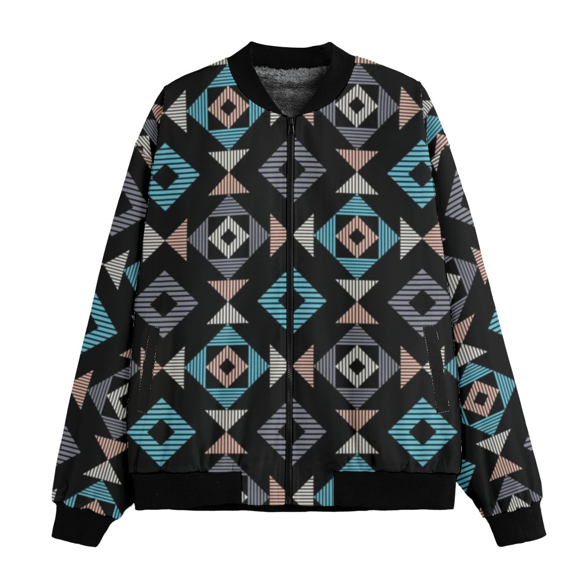 BoomBox Vibes Navajo Mosaic Rug Striped Fleece Bomber Jacket – Traditional Meets Streetwear