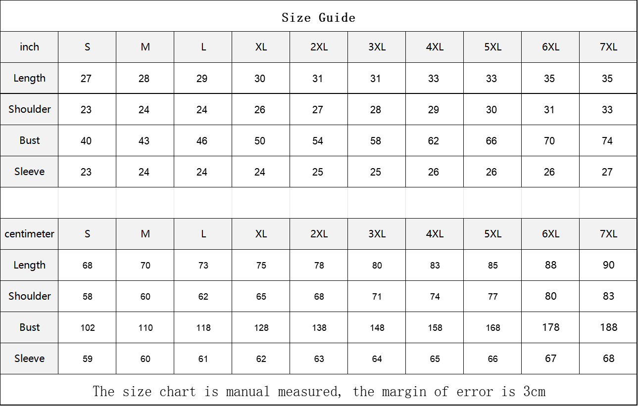 Centimeter | S | M | L | XL | 2XL | 3XL | 4XL | 5XL | 6XL | 7XL |