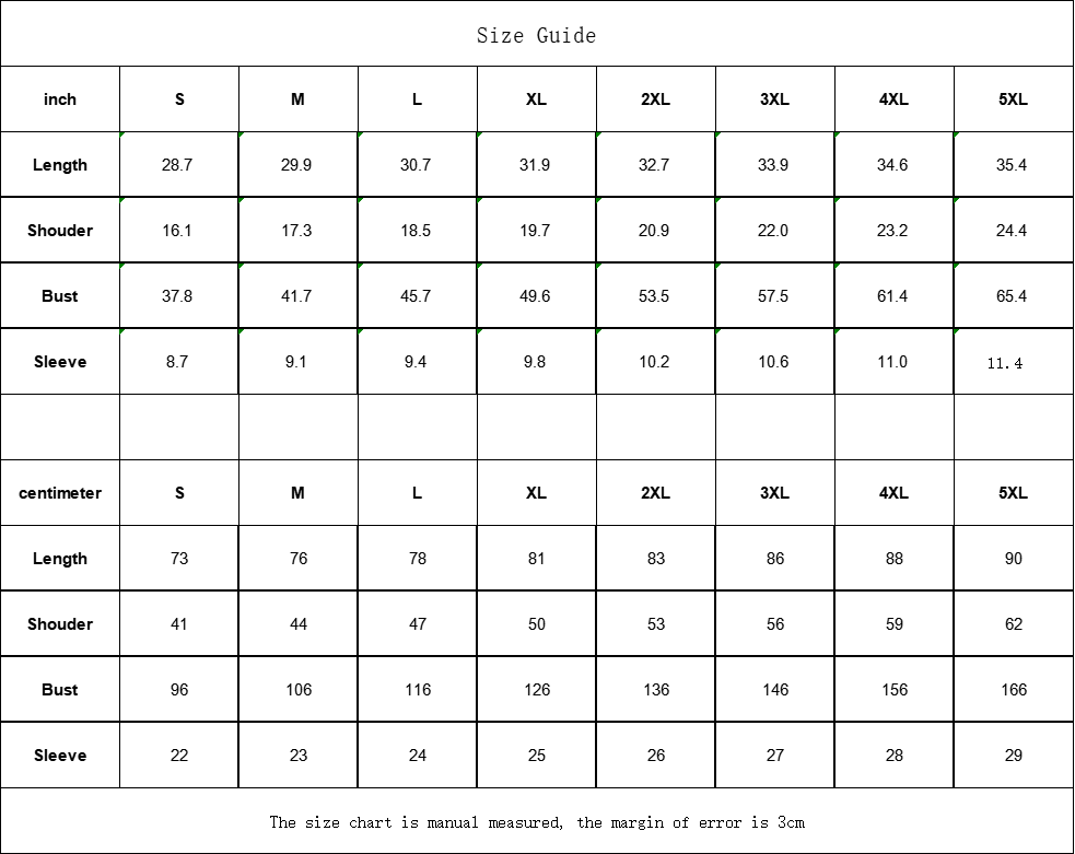 inch | S | M | L | XL | 2XL | 3XL | 4XL | 5XL |