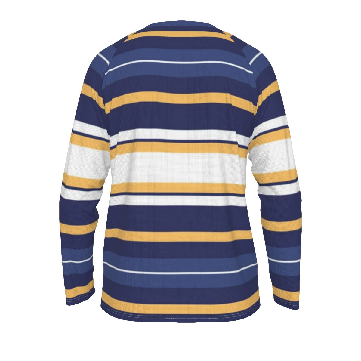 Bring a touch of bold sophistication to your wardrobe with this Navy and Yellow Striped Long Sleeve Shirt. Designed with contrasting navy, white, and golden-yellow stripes, it combines athletic spirit with everyday elegance.