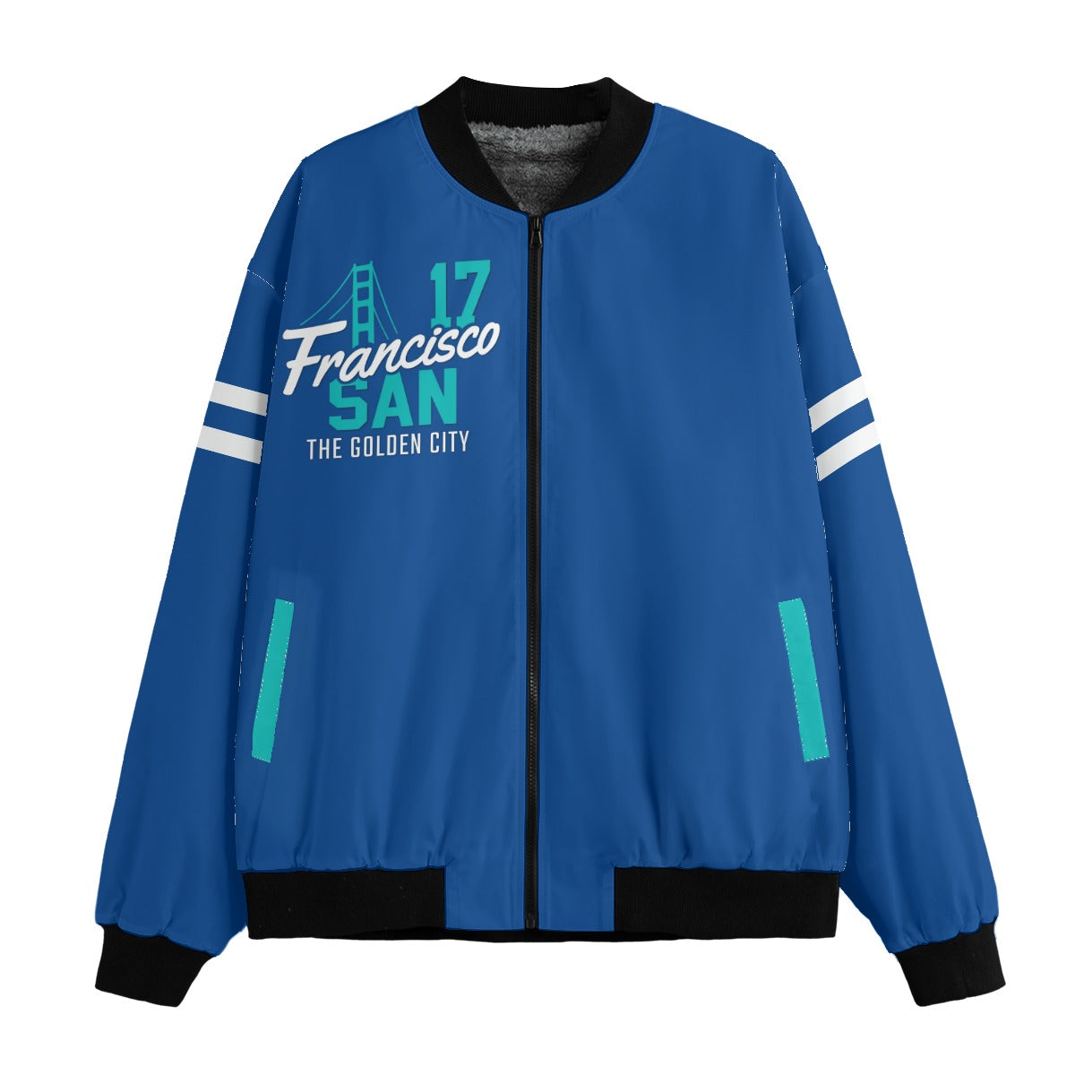 San Francisco bomber jacket, The Golden City jacket, California streetwear, urban fleece bomber, city style jacket, varsity bomber jacket, bridge design jacket, west coast fashion, blue fleece bomber, unisex streetwear fashion, San Francisco apparel