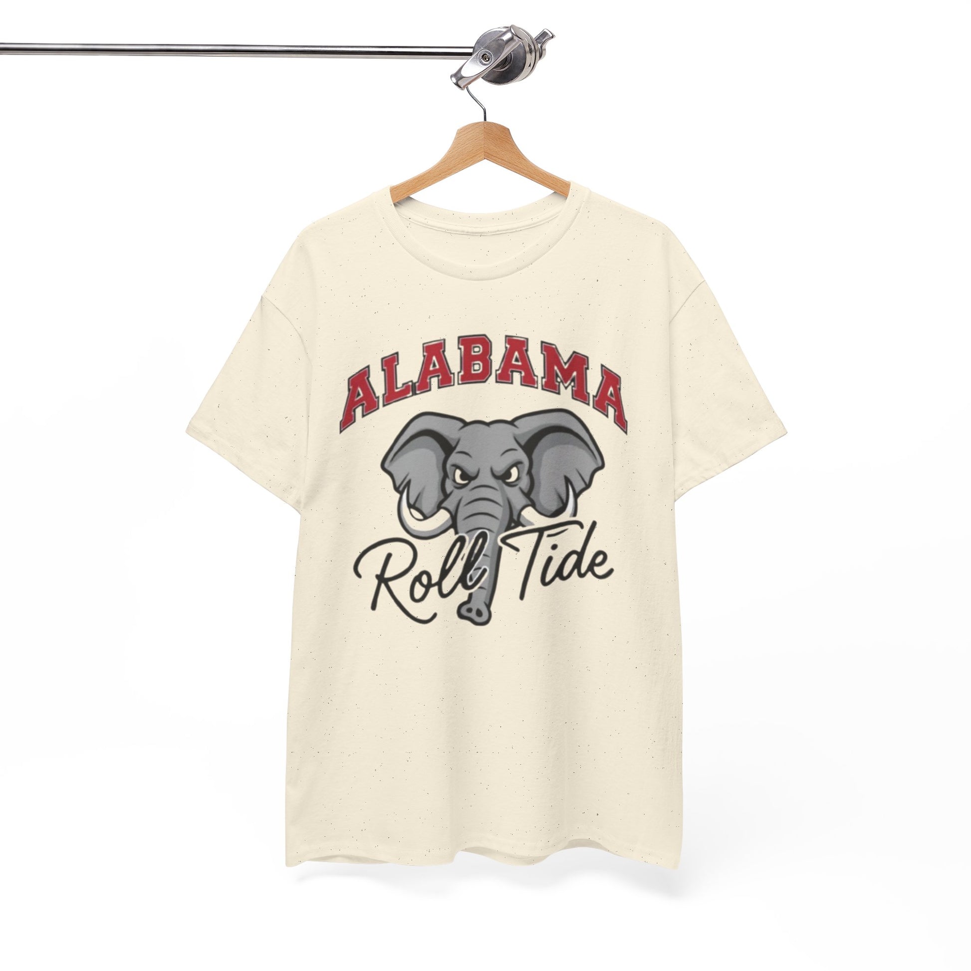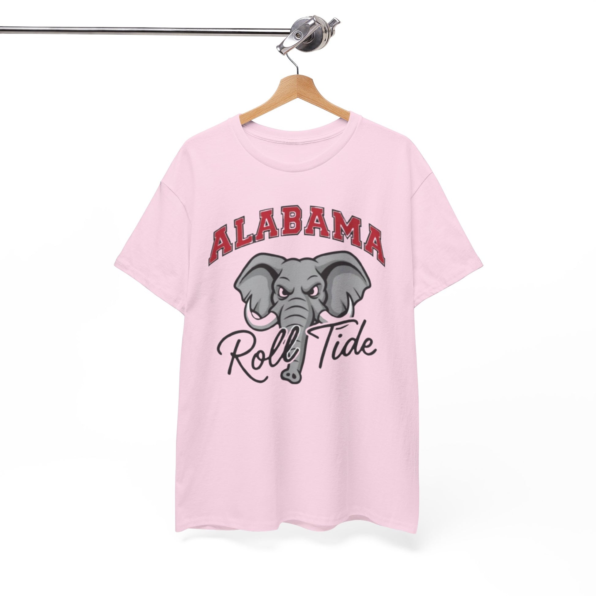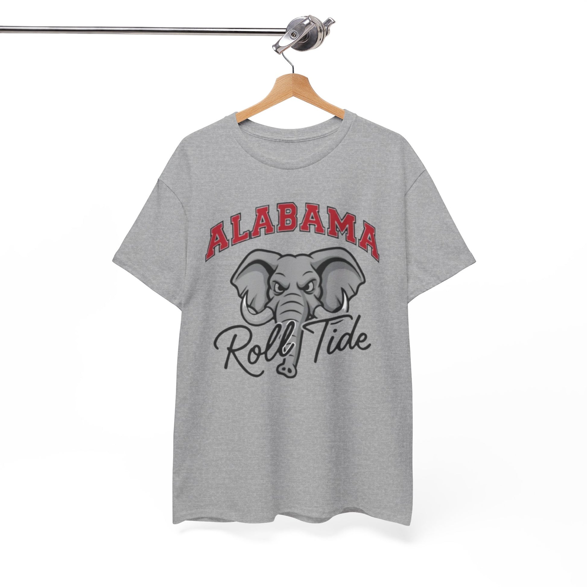 The detailed elephant graphic beneath the bold crimson “ALABAMA” and flowing “Roll Tide” script captures the unstoppable attitude of Alabama football culture. Whether you’re tailgating, walking through campus, or hitting the city, this shirt keeps you looking sharp and confident from morning to night.
