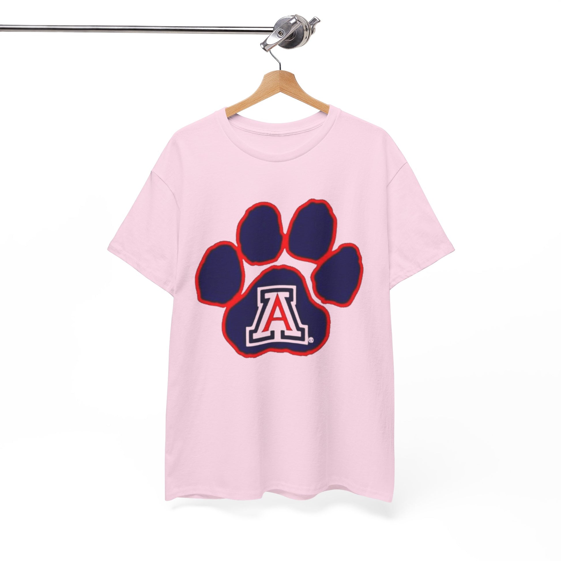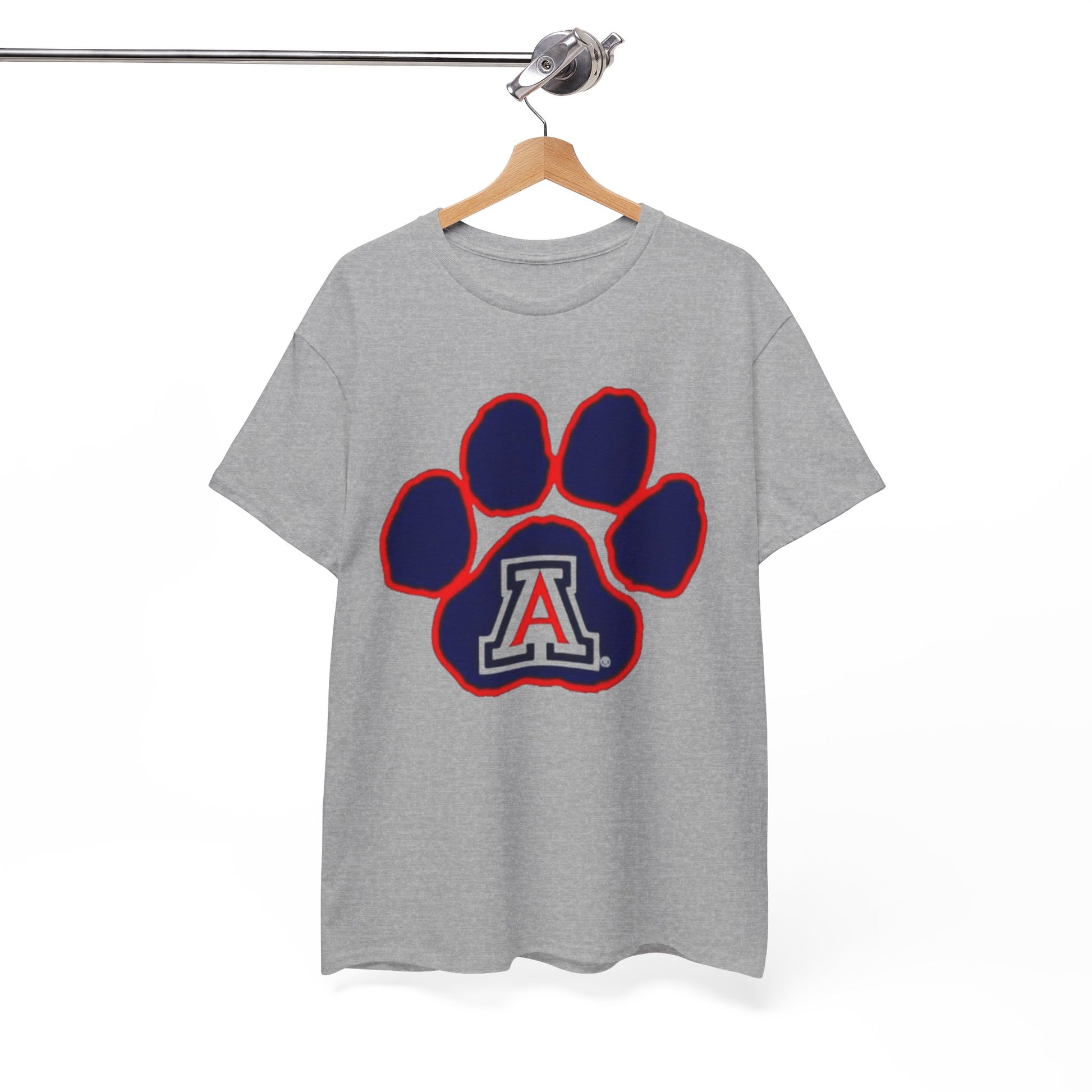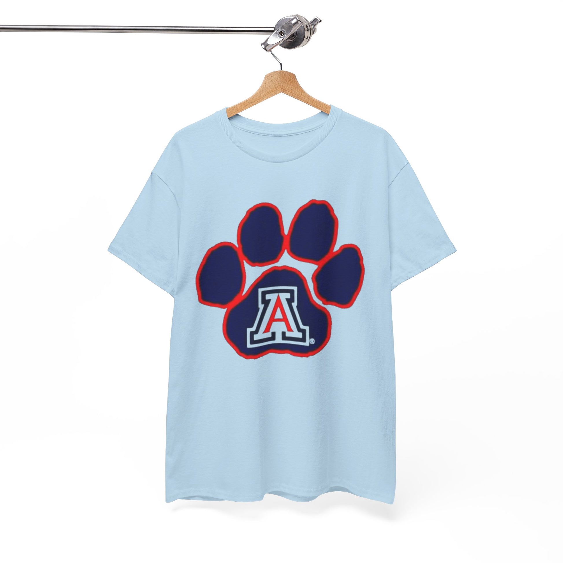 Arizona college t-shirt, blue red paw print shirt, Urban Legend apparel, Arizona streetwear fashion, college game day outfit, unisex sportswear tee, red and blue fan gear, southern streetwear style, Arizona athletic shirt, college pride clothing